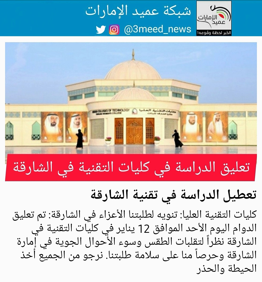 شبكة عميد الإمارات Na Tviteru كليات التقنية العليا تنويه لطلبتنا الأعزاء في الشارقة تم تعليق الدوام اليوم الأحد الموافق 12 يناير في كليات التقنية في الشارقة نظرا لتقلبات الطقس وسوء الأحوال الجوية